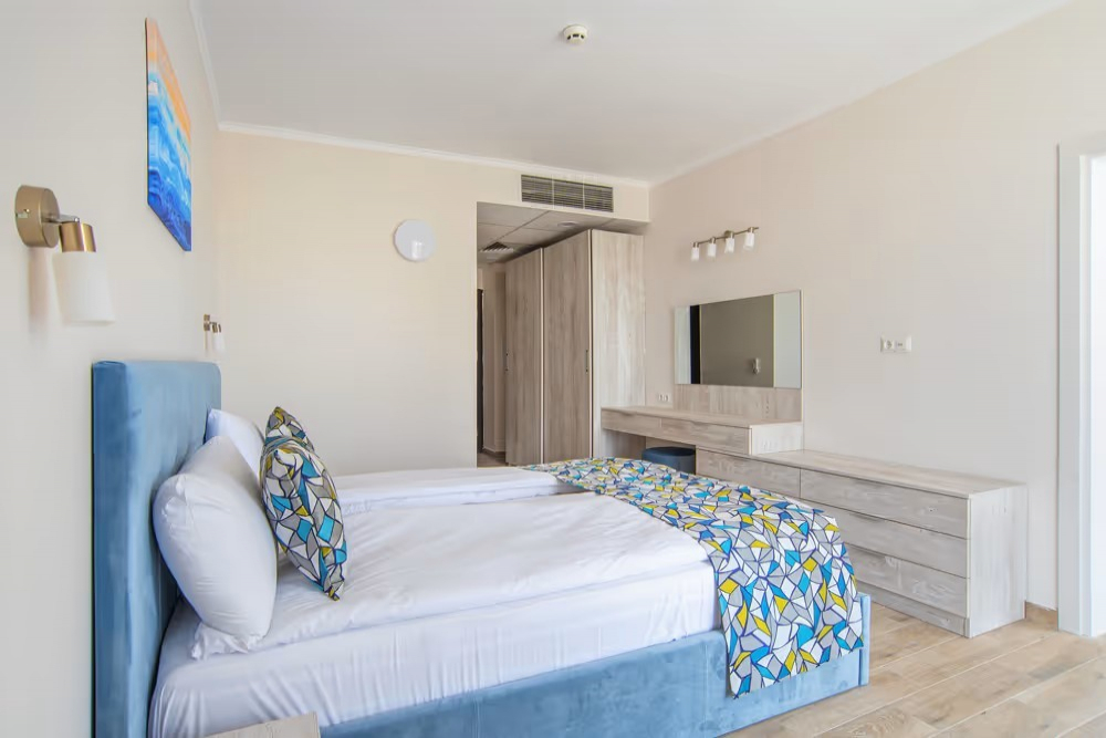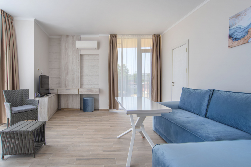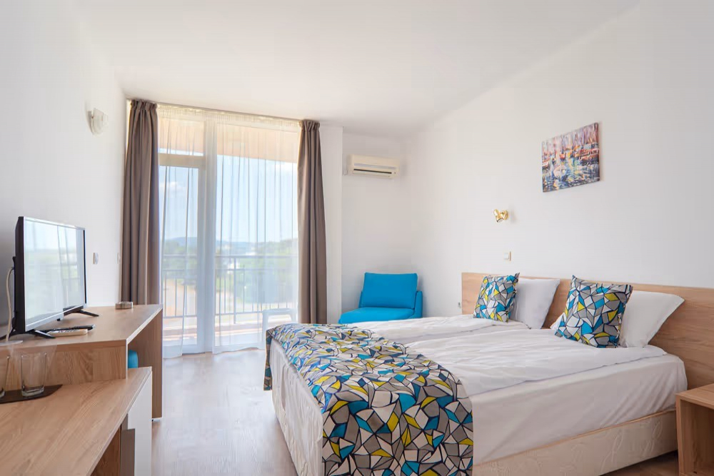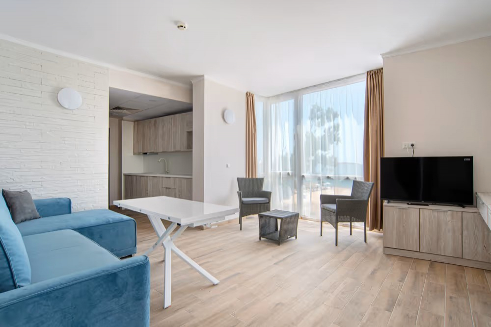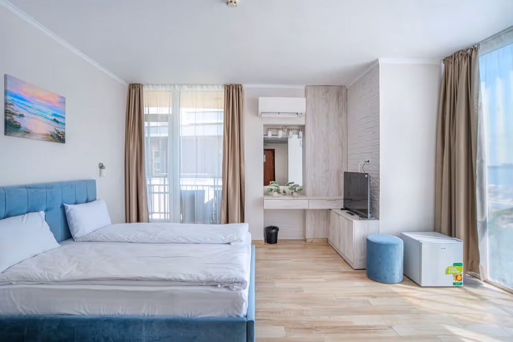 1-СПАЛЕН АПАРТАМЕНТ 2+2 ПРЕМИУМ МОРЕ (~65-100 м2): разположени на висок етаж, разполагат с едно двойно легло и всекидневна със разтегателен диван, кът за сядане, в някой апартаменти има оборудван кухненски бокс, включващ: котлони, микровълнова фурна, хладилник, кана за гореща вода и достатъчно посуда за трима, кът за хранене, нощни шкафчета, гардероб, телевизор с кабелна телевизия, Wi- Fi, климатик, самосточтелна баня с душ, балкон с маса и столове. Максималният капацитет е 3-ма възрастни и 1 дете.