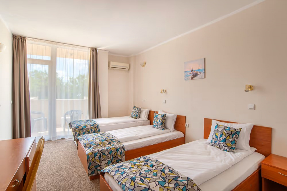 ТРОЙНА СТАЯ 3+0 ИКОНОМИЧНА (~33 м2): разполага с 3 единични легла, разтегателен фотоьойл, нощни шкафчета, гардероб, телевизор с кабелна телевизия, Wi- Fi, климатик, самосточтелна баня с душ, балкон с маса и столове. Максималният капацитет е 3-ма възрастни.