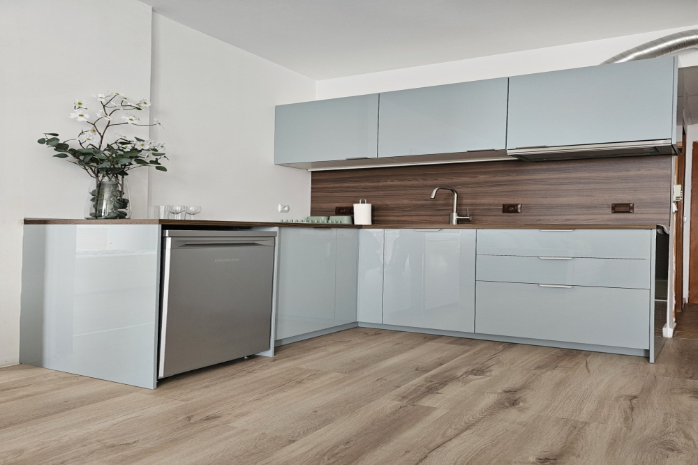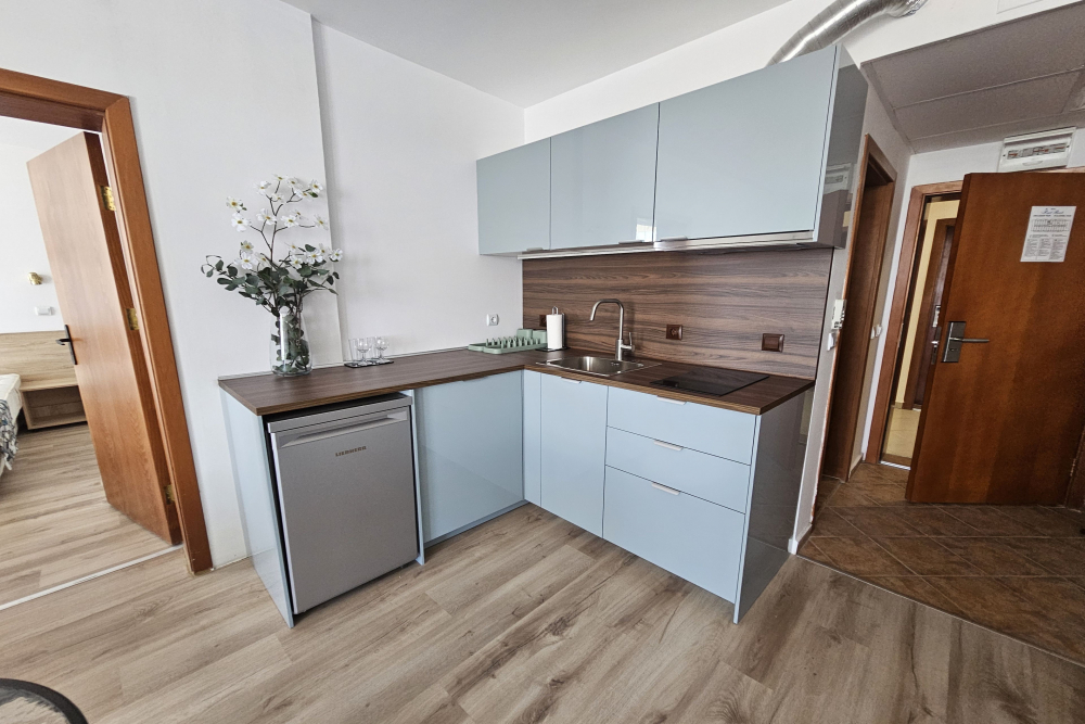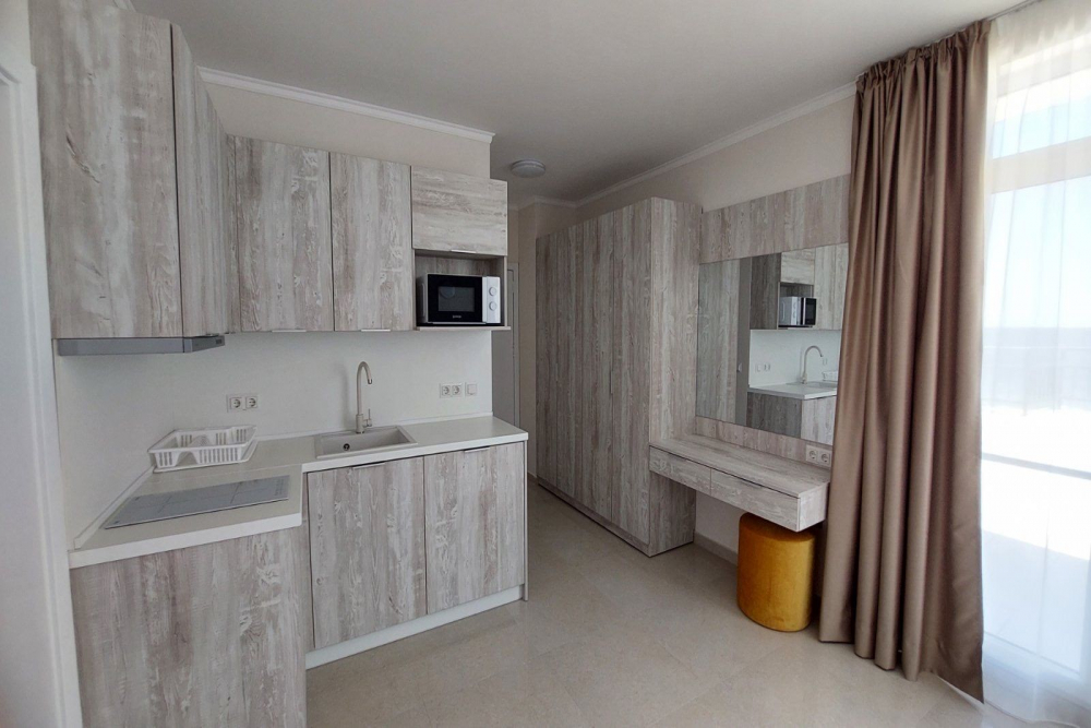 СТУДИО 2+1 (~33 м2): разполага с двойно легло и разтегателен фотьойл, оборудван кухненски бокс, включващ: котлони, микровълнова фурна, хладилник, кана за гореща вода и достатъчно посуда за трима, кът за хранене, нощни шкафчета, гардероб, телевизор с кабелна телевизия, Wi- Fi, климатик, самосточтелна баня с душ, балкон с маса и столове. Максималният капацитет е 2-ма възрастни и 1 дете.