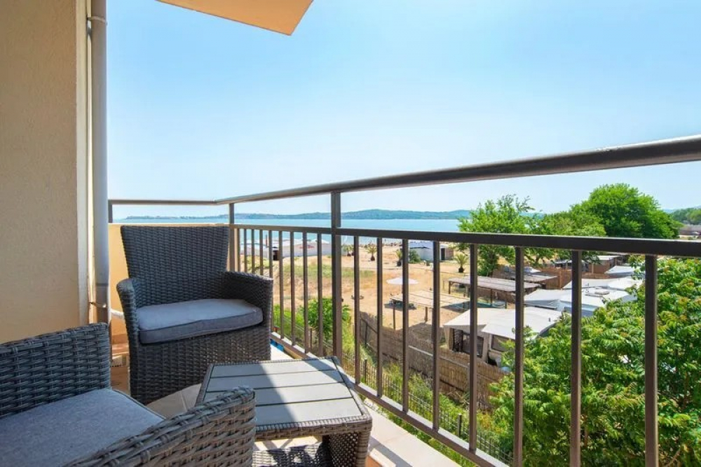 1-СПАЛЕН АПАРТАМЕНТ 2+2 СТРАНИЧНО МОРЕ (~65 м2): разположени на висок етаж, разполагат с едно двойно легло и всекидневна със разтегателен диван, кът за сядане, в някой апартаменти има оборудван кухненски бокс, включващ: котлони, микровълнова фурна, хладилник, кана за гореща вода и достатъчно посуда за трима, кът за хранене, нощни шкафчета, гардероб, телевизор с кабелна телевизия, Wi- Fi, климатик, самосточтелна баня с душ, балкон с маса и столове. Максималният капацитет е 3-ма възрастни и 1 дете.