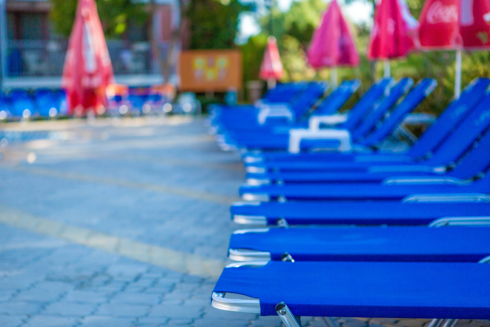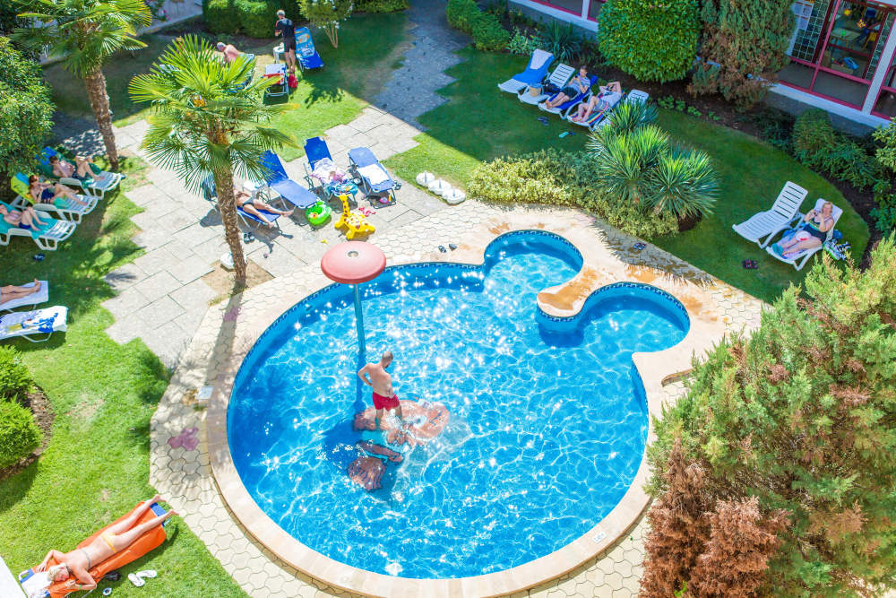 Басейн с шезлонги и чадъри около басейна, според наличността