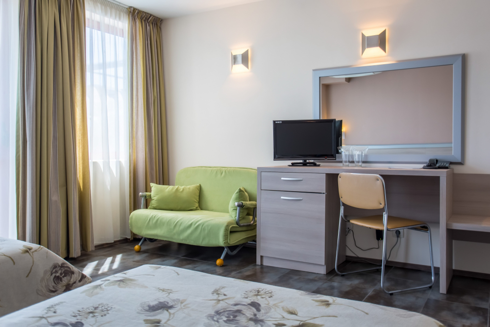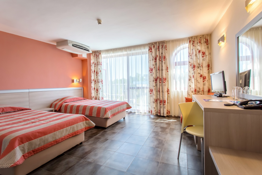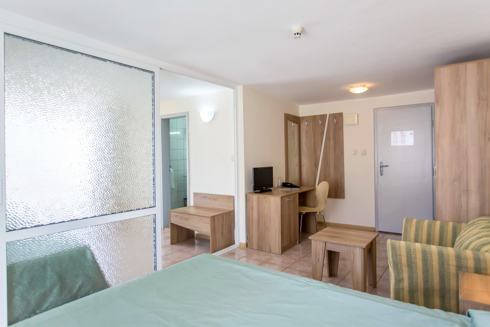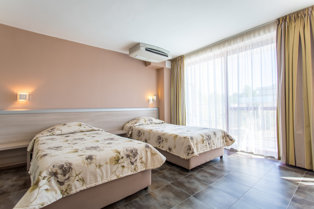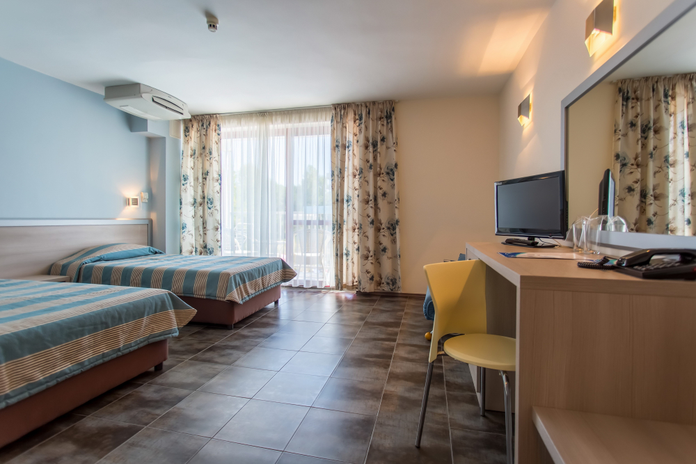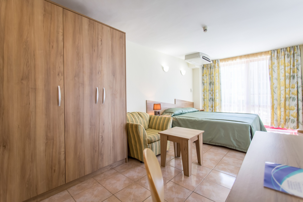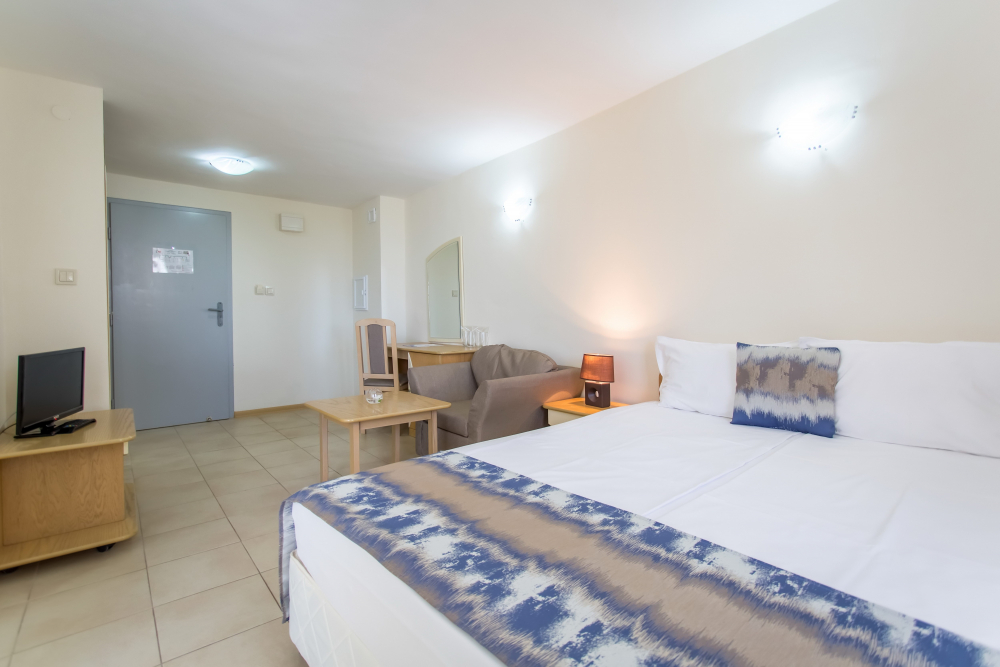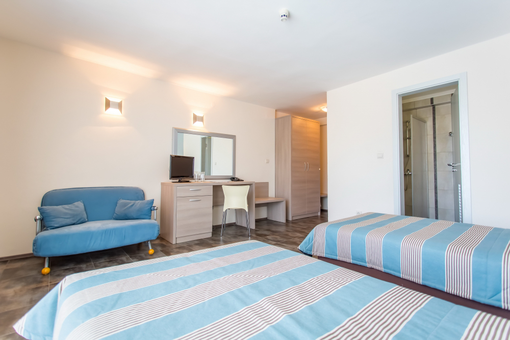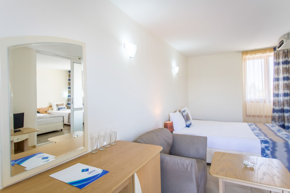 ДВОЙНА СТАЯ 2+1 СУПЕРИОР: Приблизително 18-25 м2 (реновирана през 2025/26 г.) Двойните супериорни стаи разполагат с 2 единични легла, разтегателен диван, кабелна телевизия, телефон, мини хладилник, централна климатизация, мрежа против комари, Wi-Fi; сейф (безплатно); балкон с маса и столове, баня с тоалетна и душ, козметично огледало, сешоар, теракот. Максималният капацитет е 2 възрастни и 1 дете или 3 възрастни.