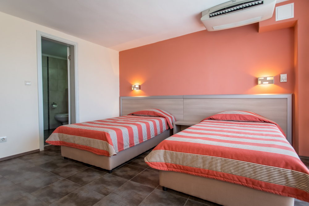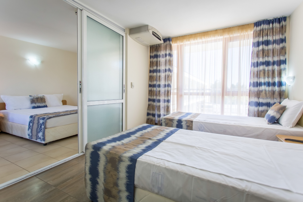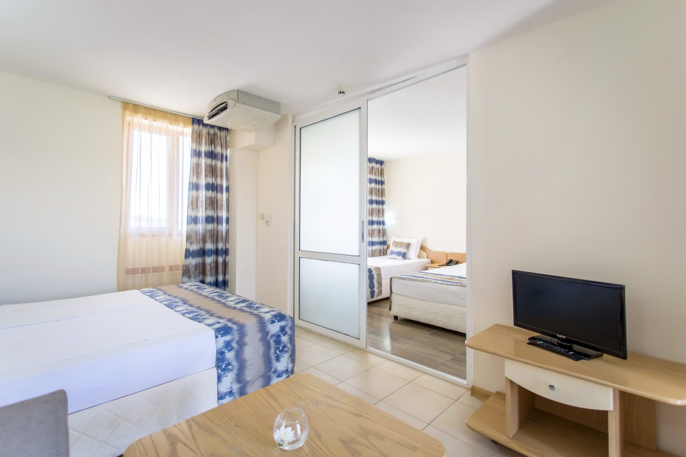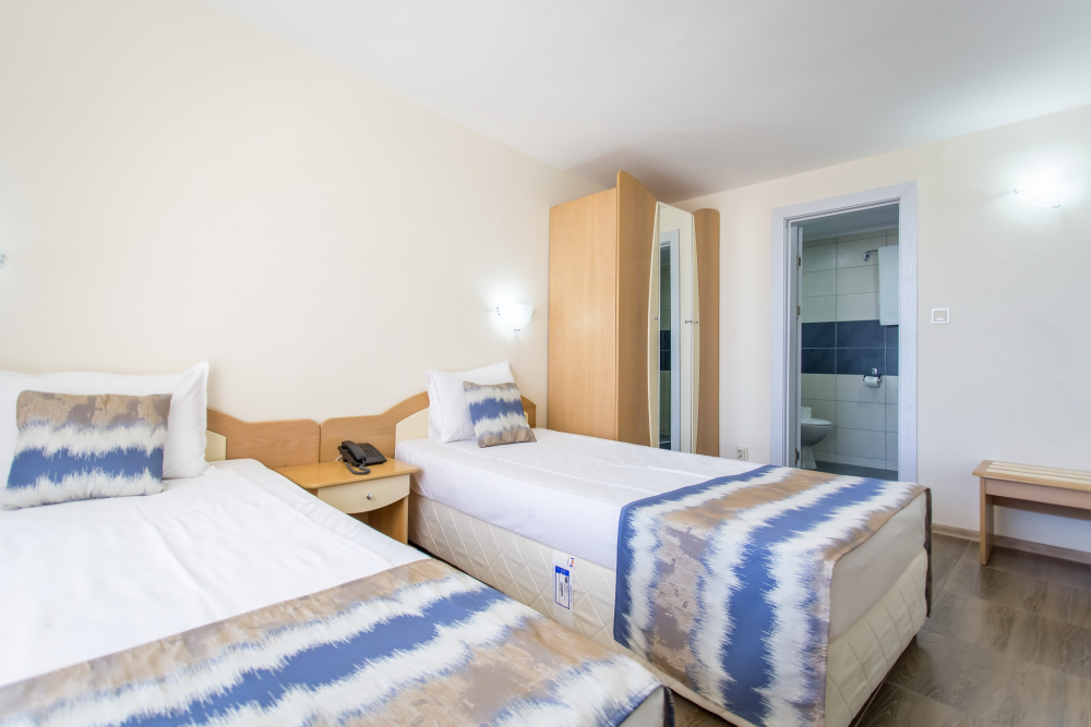 ДВОЙНА СТАЯ 2+1: Приблизително 18-25 м2. Двойните стаи разполагат с 2 единични легла, разтегателен диван, кабелна телевизия, телефон, мини хладилник, централна климатизация, мрежа против комари, Wi-Fi, балкон с маса и столове, баня с тоалетна и душ, козметично огледало, сешоар, теракот. Максималният капацитет е 2 възрастни и 1 дете или 3 възрастни.