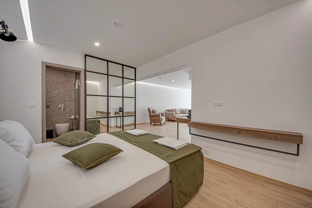 Настаняванe: Архитектурният проект предлага 32 луксозно обзаведени двойни стаи и 8 апартамента с директна гледка към морето. Панорамата, която се открива от всяка стая и всяко студио, създава уникална и неповторима атмосфера. Не е наличен асансьор.