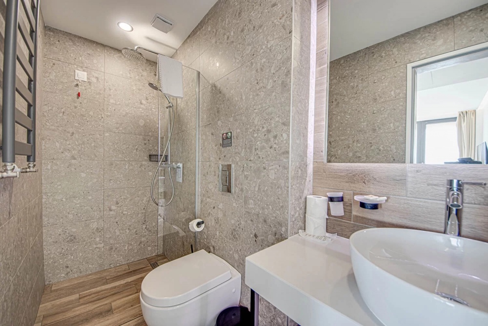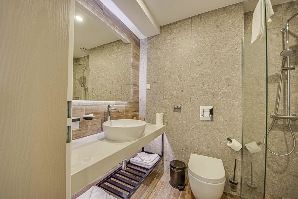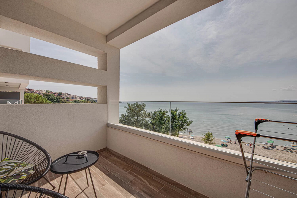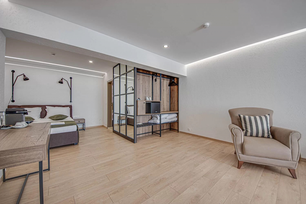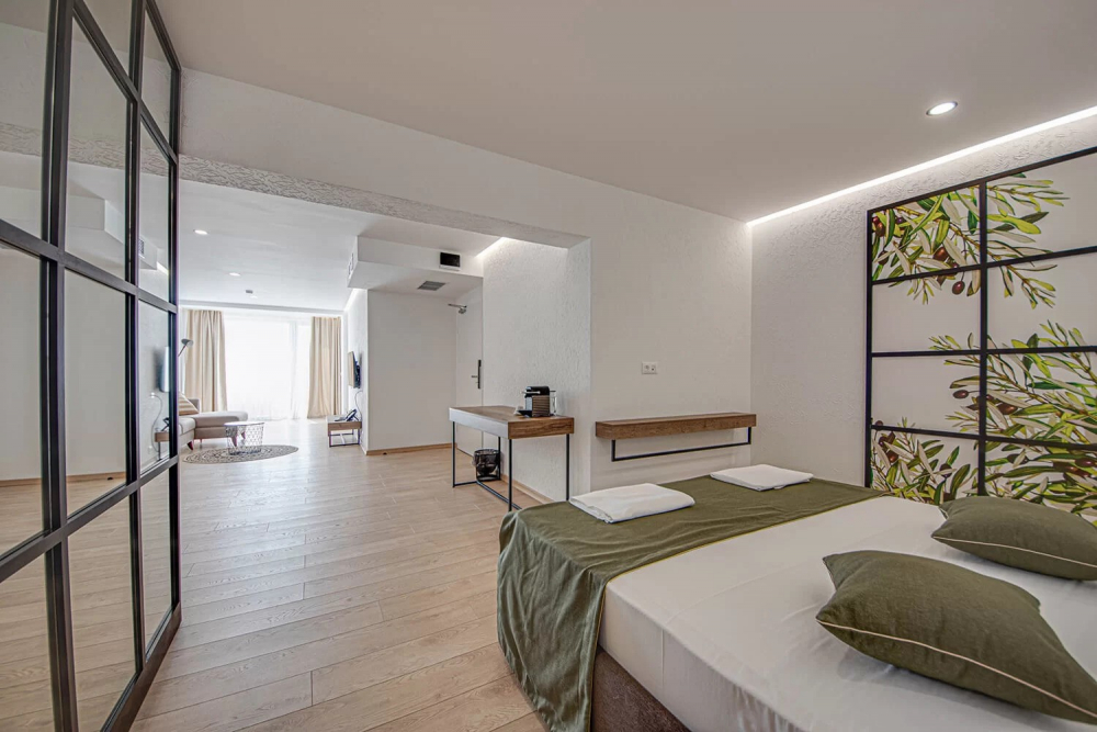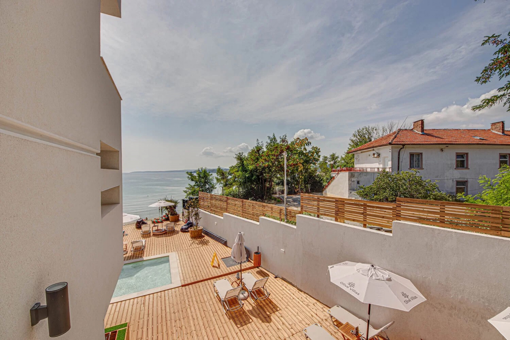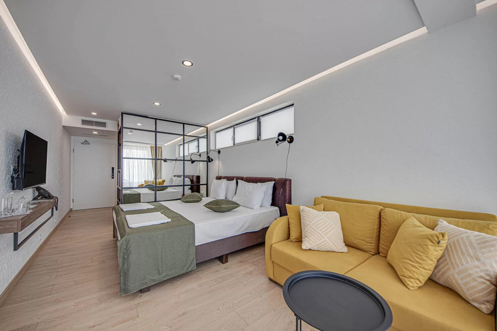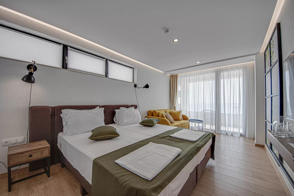 ДВОЙНА СТАЯ 2+0 SMALL BOUTIQUE: Приблизителна площ от 21 кв. м. Стилно обзаведени, стаите ни откриват прекрасна панорамна гледка към морето, за да усетете морския бриз и да се заредите с витамини от слънчевите лъчи.Стаите разполагат с голямо двойно легло, безплатен Wi-Fi интернет, сейф, мини бар, климатик, баня с душ, луксозна козметика за баня и тераса с гледка към морето. Максимално настаняване 2 възрастни.