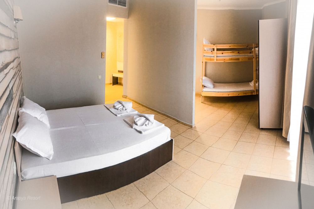 ФАМИЛЕН АПАРТАМЕНТ 4+2/3+3: Приблизителна площ от 40 кв.м. Апартамента разполага с една преходна стая и една спалня. В преходната стая има голям разтегателен диван. Оборудван е с климатик, мини бар, ТВ, телефон, тераса, Wi-Fi, самостоятелна баня с душ и вана, сешоар, шампоан и хавлия за баня. Максимално настаняване на 4 възрастни и 2 деца или 3 възрастни и 3 деца.