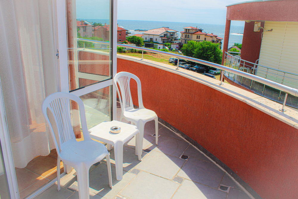 СТУДИО 2+2: Приблизителна площ от 25 кв. м. Студиото се състоят от две преходни помещения без врата между тях. В едното помещение има две легла, а в другото двуетажно легло. Оборудвано е с климатик, мини бар, ТВ, телефон, тераса, Wi-Fi, самостоятелна баня с душ, сешоар, шампоан и хавлия за баня. Максимално настаняване на 2 възрастни и 2 деца.