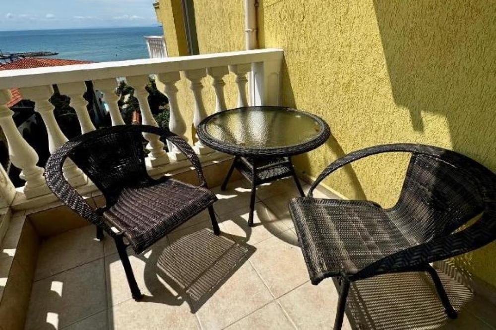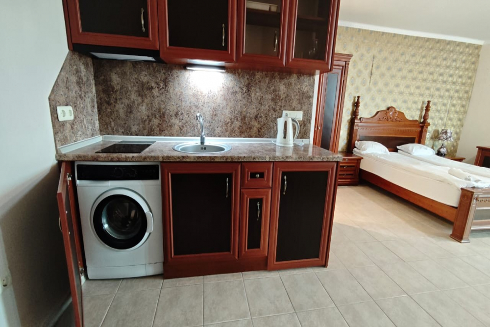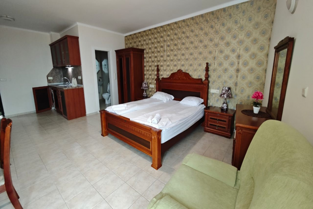 СТУДИО 2+1 / 2+2 МОРЕ: Приблизителна площ 35 кв.м. Всяко студио разполага с голямо двойно легло и разтегателен диван; кухненски бокс с посуда, микровълнова печка, електрически котлон, хладилник, пералня, машина за чай/кафе, ютия, дъска за гладене, сешоар, сейф и др. Баня с тоалетна и климатик. Максимално настаняване 2 възрастни и 2 деца или 4 възрастни.